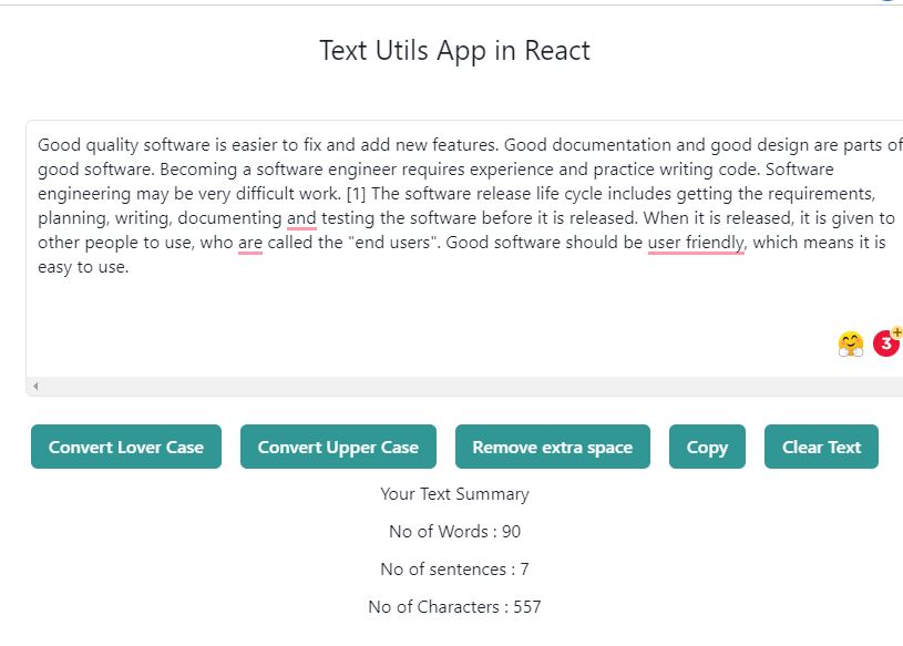 This app allow user to use text base features for example letter upper case, lower case, remove extra space.And also give summay of all text no of word and character.Is is solo project developed in 2 days